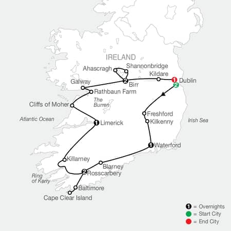 This relaxed 10-day tour combines many lesser visited parts of Ireland with some of the must-see iconic locations. The delights of Dublin, Kilkenny, Waterford, Killarney, and Galway are combined with more remote and unique experiences. Hear from an expert about the ancient Gaelic sport of hurling and take the chance to hit a few “sliotars” yourself; take a boat ride over to the tiny island of Cape Clear where one of its 110 inhabitants will tell all about their life; make (and eat) your own scones and watch a sheep dog at work at a typical Irish farm; have lunch in an Irish pub; hear about the ancient art of whiskey distilling at a modern distillery at the cutting edge of 21st century sustainability; and visit one of the world 's premier horse studs. You 'll leave with your Irish Heart filled! PLUS, your tour includes your choice of excursions in Waterford so you can plan your day your way.